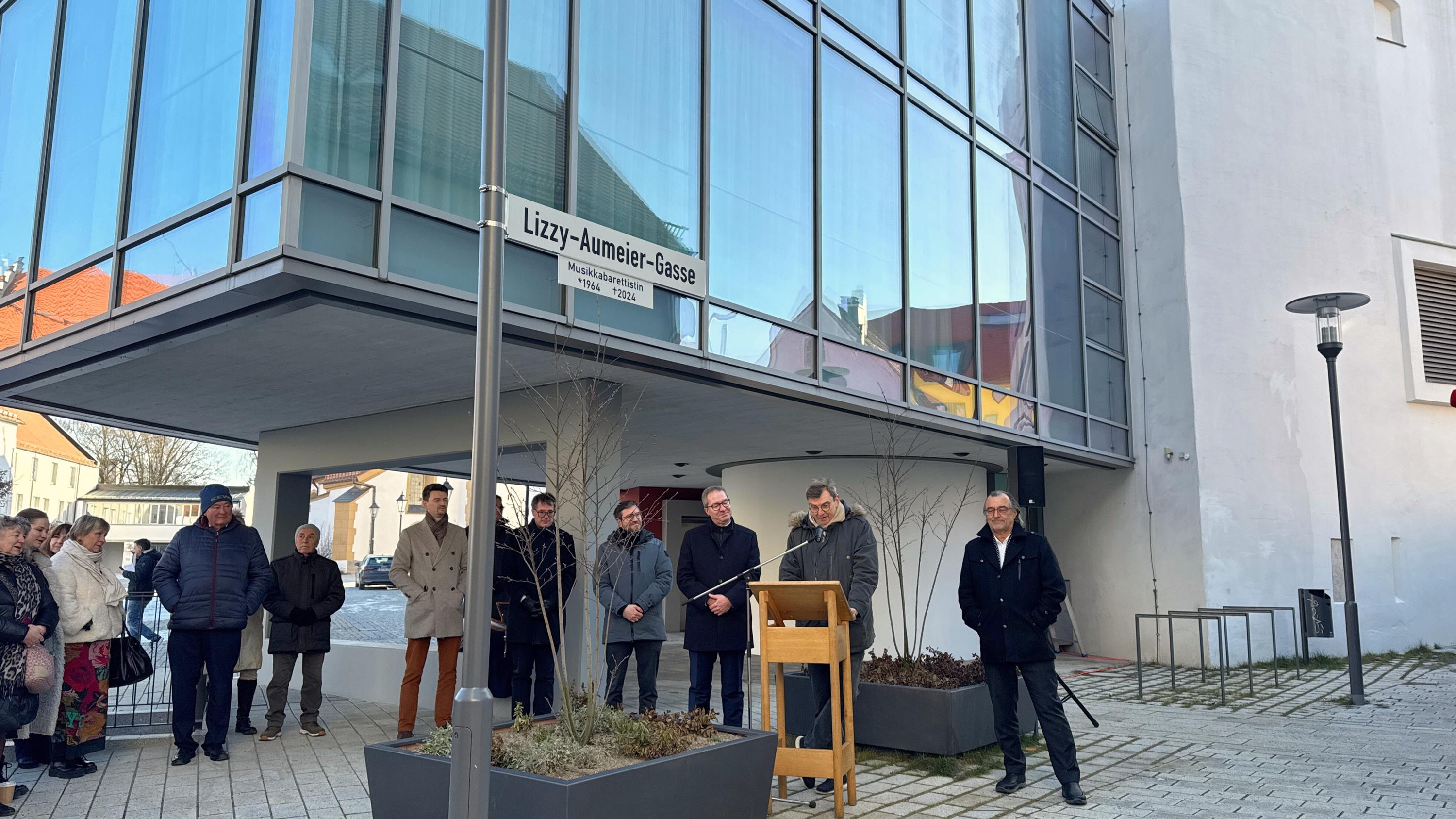 Mit einer feierlichen Zeremonie hat die Stadt Neumarkt i.d.OPf. am 20.01.2026 die neue Lizzy-Aumeier-Gasse eröffnet und damit einer außergewöhnlichen Künstlerin, engagierten Bürgerin und bedeutenden Botschafterin der Oberpfalz ein dauerhaftes Andenken gesetzt. Die Gasse ist bei den Bauarbeiten im Zuge des Hochschul-Baus entstanden und führt vom Residenzplatz und der Kaminfegergasse in die Hutmachergasse.
