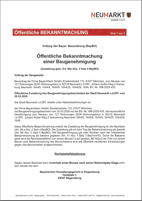 25. März 2026: Öffentlicher Zustellung des Baugenehmigungsbescheides der Stadt Neumarkt i.d.OPf. vom 25.03.2026