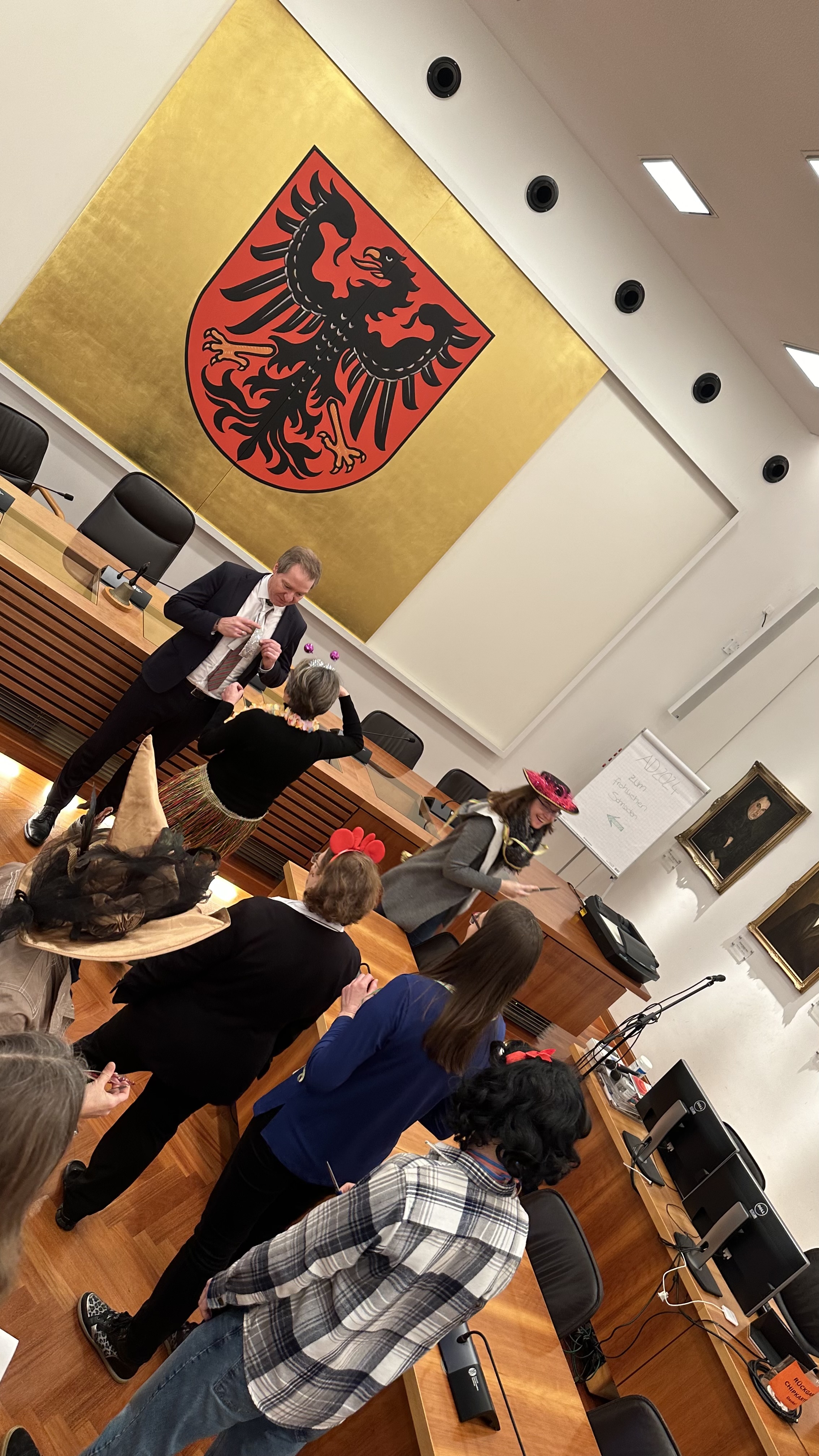 08. Februar 2024: „Schnipp-schnapp schon ist die Krawatte ab“ – ganz so einfach haben es die Mitarbeiterinnen der Stadtverwaltung dem „neuen“ Oberbürgermeister Markus Ochsenkühn dann doch nicht gemacht. Eine ganze Horde Damen und solche die sich an diesem Tag wie eine fühlten, wollten sich ein Stück (Krawatte) vom OB abschneiden.