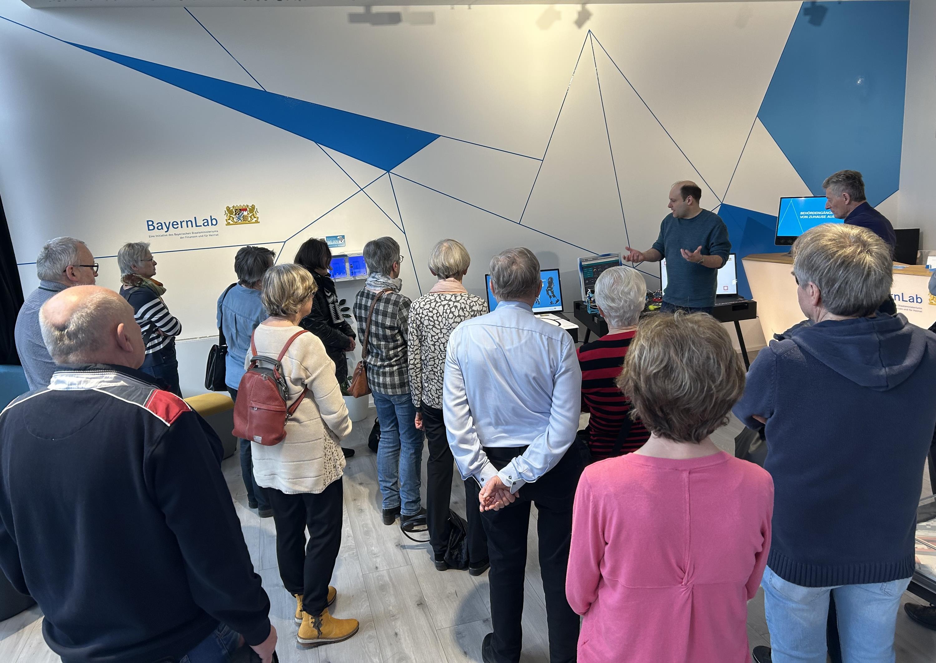Ende Februar folgte eine ebenso gut besuchte Führung durch das BayernLab in der Nürnberger Straße 2. Insgesamt 17 Seniorinnen und Senioren erhielten spannende Einblicke in moderne Technologien wie Robotik, Geodaten, 3‑D‑Druck und Virtuelle Realität. Besonders eindrucksvoll war der abschließende Test der eigenen Schwindeltauglichkeit mittels VR‑Brille, der für einige überraschende Aha‑Momente sorgte.